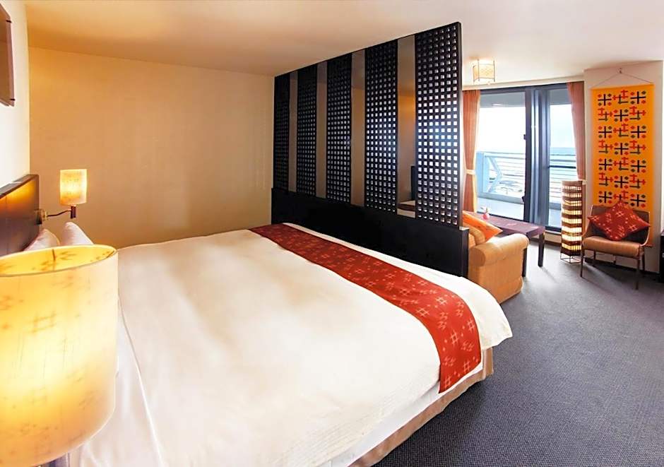 Air-conditioned room featuring sea views through floor-to-ceiling windows, an LCD TV and a safe. The seating area has a sofa and a coffee table, and amenities include toiletries, free wired internet and nightwear.